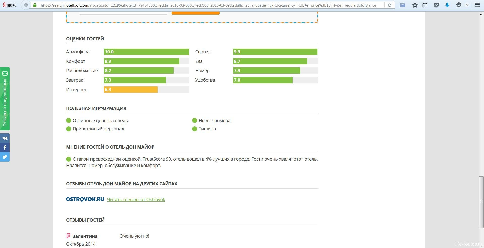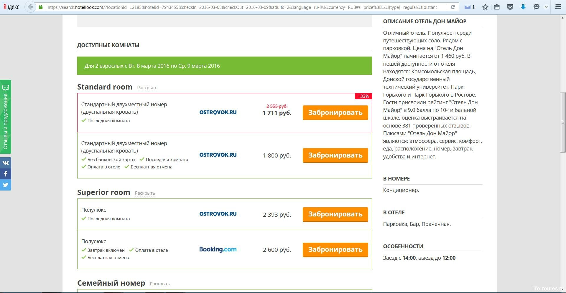Хотеллук представил самые дешевые варианты в разных системах. Как видим, полулюкс с бесплатной отменой дешевле на Букинге, а обычный номер на Ostrovok.ru. Тут же описание, предоставляемые услуги и особенности проживания. Еще ниже оценки посетителей и их отзывы.