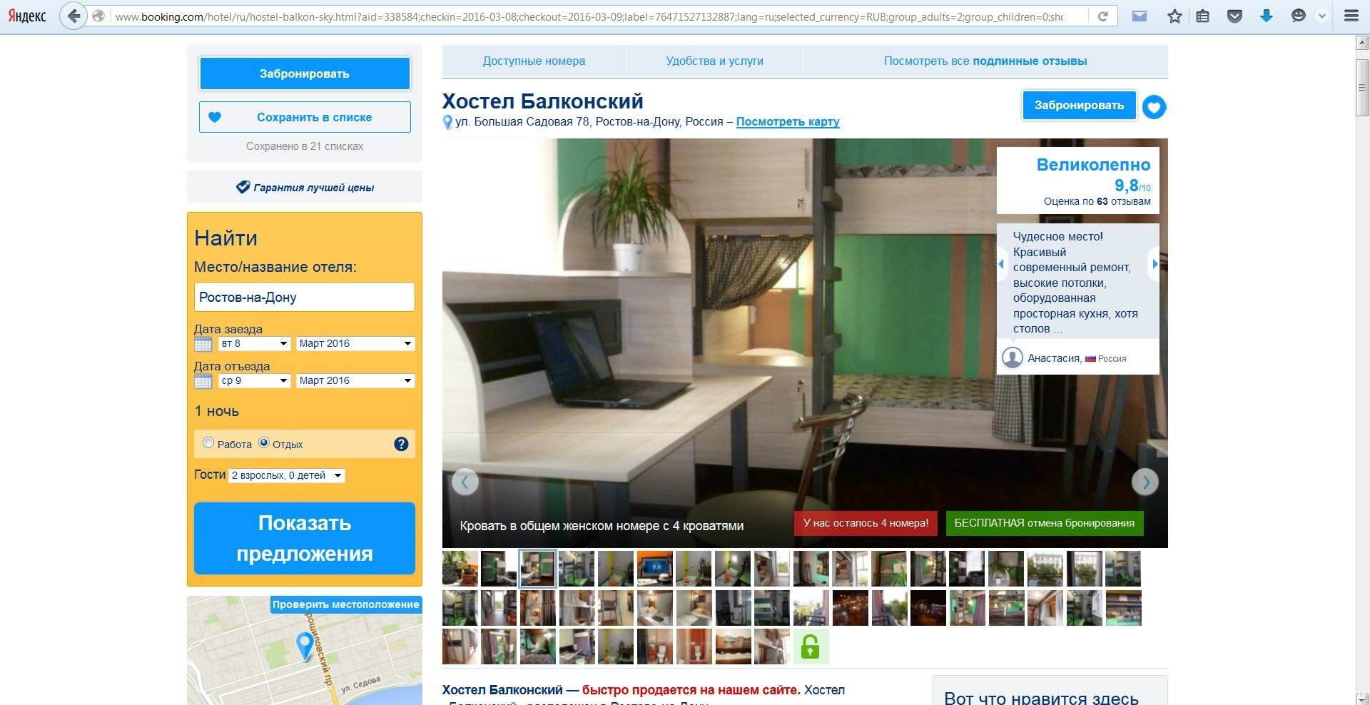 Перейдем на страницу отеля, чтобы почитать о нем подробнее. На странице можно увидеть фото интерьера, оценки гостей…