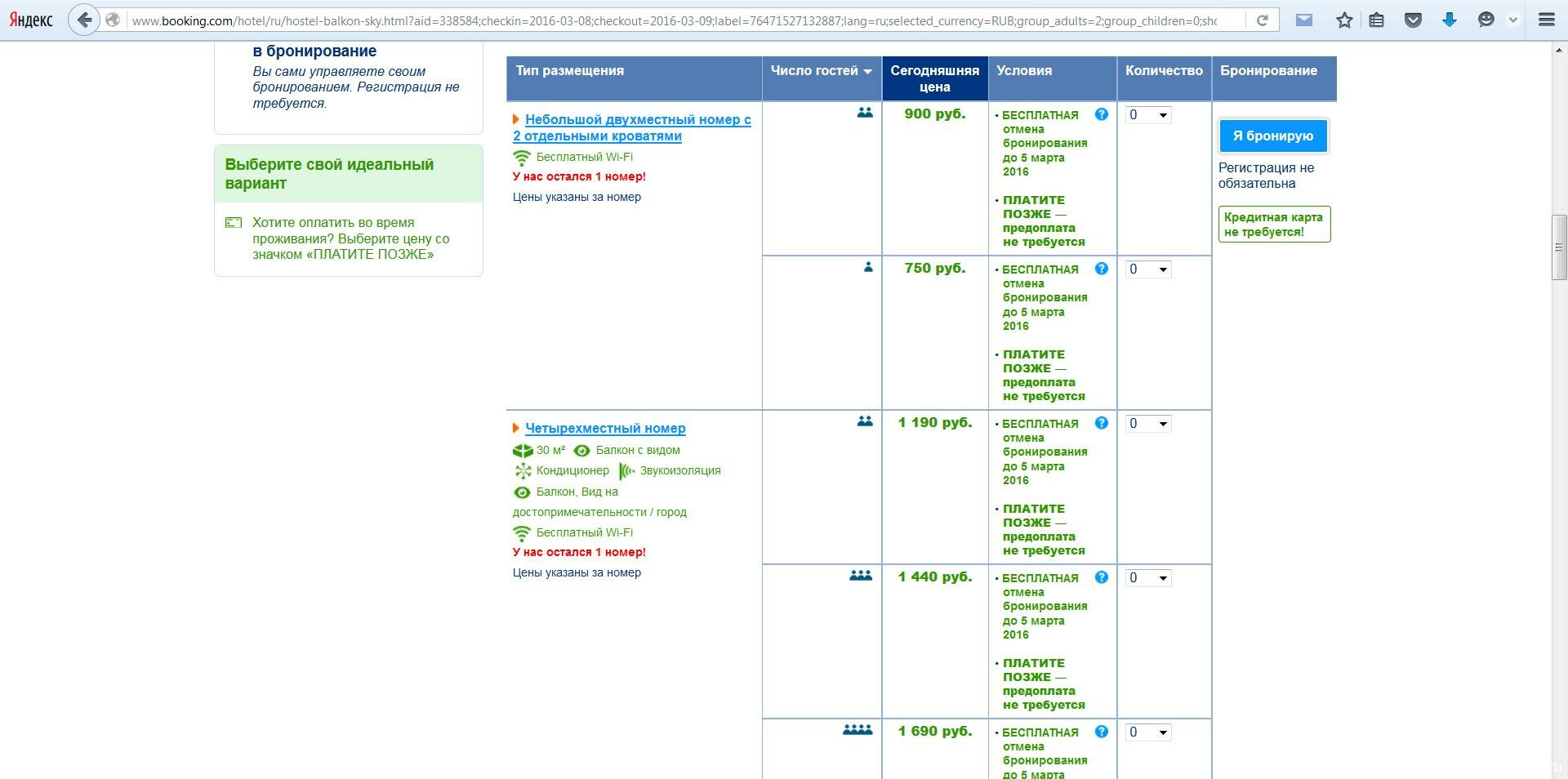 Без завтрака самый дешевый номер на двоих обойдется всего в 900 рублей! Обращаю внимание, это отдельная комната, а не кровать в общем номере! И по отзывам оценка почти 10! По-моему вполне не плохо. Можно переходить на сайт booking.com и оформлять бронь. На Букинге можно ознакомиться с конкретными номерами и предоставляемыми услугами.